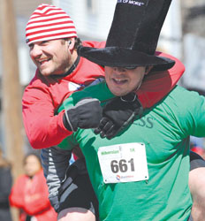 News He Certainly Ain’t Light by Transcript Staff • March 26, 2015 • 0 Comments Brian Leslie of Winthrop carries his friend Dan Wilson, also of Winthrop, across the finish line during the annual Hibernian 5K St. Patrick’s Day Recovery Run in Lynn. The race has been run for six years to raise money for scholarships.