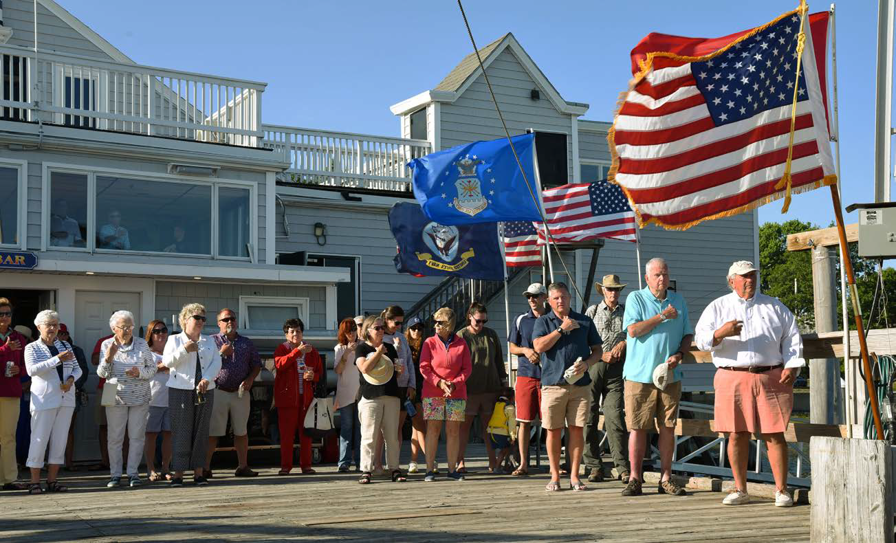 The Cottage Park Yacht Club (CPYC) celebrated its Blessing of the Fleet with a barbecue and boat parade on July 9. A moment of silence was held in honor of Past Commodore Mike Gahan, who began the maritime tradition at CPYC. Shown here, Cottage Park Yacht Club members praying for safety of boats and families this summer during the annual Blessing of the Fleet.
