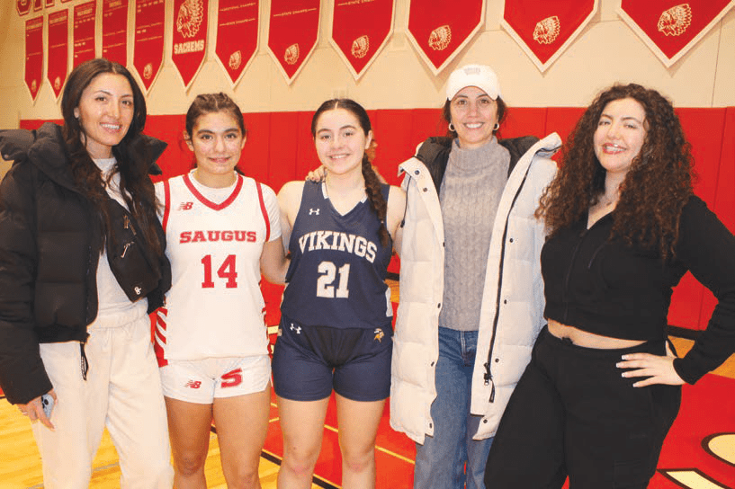 with her basketball-playing cousins, from left, Niki Tsiotos, Georgia Condakes of Saugus High, Katerina Mallios, and Poli Tsiotos.