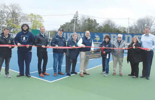 Pictured at the rededication ceremony are, from left, Winthrop High Director of Athletics Matt Serino, WHS Assistant Tennis Coach Augie Cherico, WHS Principal Matt Crombie, Tennis Courts Project Committee Chair Dave Girard, Town Counci President Jim Letterie, Karin Chavis of the School Building Assistance Committee, WHS Boys Tennis Head Coach Marie Finn, Dick Lawton of the School Building Assistance Committee, Town Clerk Denise Quist, and State Rep. Jeff Turco.